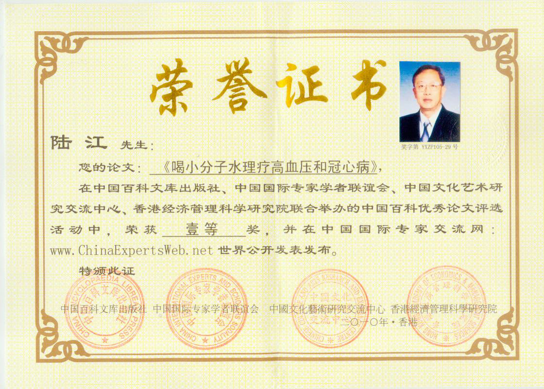 一.發明的亮點是中國基礎醫學研究成果的轉化醫學應用------------------------------------------------------------------------------------ 1990年春,我50歲,發現患了高血壓,便及時遵醫囑服藥。我想起父輩、祖輩曾患高血壓,后來都患中風癱瘓或心梗過世,所以心中壓力大。我夢想能根治高血壓,便研究醫學。當我檢索到中國基礎醫學研究成果,采用高脂餐和磁處理小分子團水飼喂小白鼠或大白免等兩組哺乳動物,經過2、4、6個月剖殺血檢,發現飼喂小分子團水的試驗組動脈內壁干凈,能減輕和延緩動脈粥樣硬化。我從這些研究成果受到啟發。覺得有責任研制出優良的器具,讓天下人能真正治愈高血壓,消除動脈粥樣硬化,延年益壽。于是,1990年我做成樣品,先后與愛人飲用兩三個月,分別治愈了高、低血壓,之后我們的血壓都正常,癥狀消失。該水經南京大學做核磁共振檢測為55.82赫茲的微小分子團水。該品經工業開發后,1994年送給廣西三家三甲醫院做臨床試用4個月,再經北京和廣西醫學專家鑒定認為:“降脂降壓效果好” ,“能擴大心腦動脈流量,改善心腦電圖和微循環” ,“對治療心腦動脈粥樣硬化、高血壓、高血脂有良好的醫療保健作用”。1996年產品獲得中國發明專利權。這就使產品可以轉化為醫學應用,人類可逐漸改變終生服藥,自己祛除病癥。